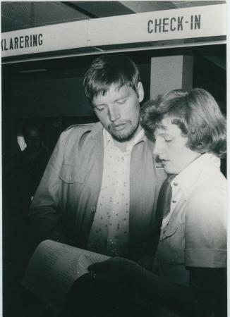 Reseledaren Åke Rönnqvist gör en sista kontroll av passagerarlistan med Inger Ek före resan till Vancouver. Se årsbok 1978