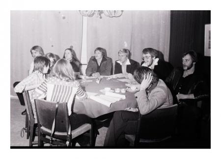 Österbottniska delegater vid mötet Bertel Nygård, Christina Nygård, Lasse Ekström, Håkan Westermark, Sture Erickson och Bengt Lybäck, med ryggen mot kameran Viviann Liljeström, Stina Engström, Gunn-May Fagersund, Guy Käcko