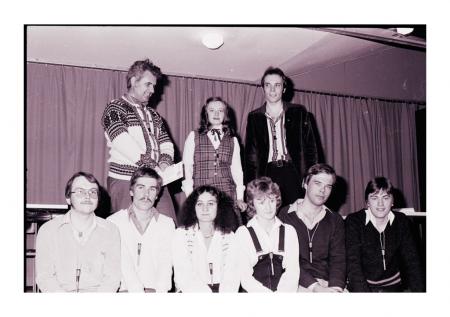 Uppe t.v. lärare Paul Pått, ?, T.h. möjligen Johan Wasberg Bengt Ingo, Harry Backlund, ? Backgren, Britt-Marie Enholm, Bernt Björkholm, Börje Maars.