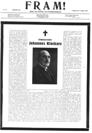 Johannes Klockars dödsruna och begravning i Fram! nr. 18 och 19 1932