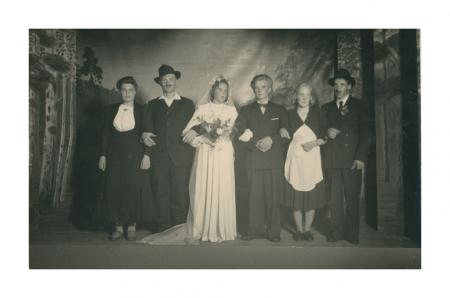Vid föreningens 40 års jubileum. Inga Brors, Ernst Åkers, Gunda Sandås, Åke Åkers, Vera Krooks, Gert Blusi. Teaterstycket "Tösen på Björkeberga"
