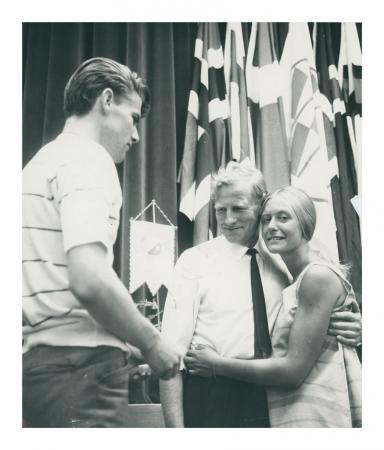 Börje Lassfolk överräcker SÖU:s bordsstandar, Nordivalgeneralen Bodvar Tommerås avtackas (Formannen i Nordivalsnemnda 1969), Inger Söderman-Backman. Se årsbok 1969.