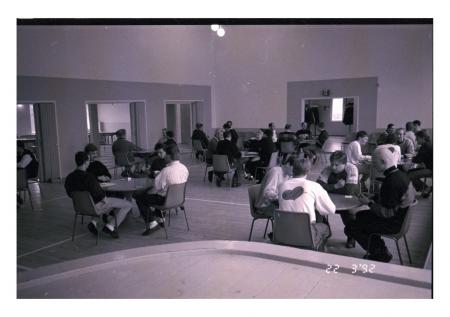 vid bordet t.v. Peter Back med ryggen mot scenen, Göran Udd mittemot, vid bordet i mitten Wilhelm Backa d.ä. med ryggen mot, Dan Ingman mittemot, vid bordet bakom Olof Back med ryggen mot, Gustav Back mittemot (Iskmo-Jungsund)