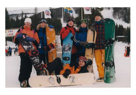 Carola Sandström, Jessica Malmsten, Jenny Rönnqvist (Jenny Nygård), Carolina Westermark (Carolina Håkans), Anna-Stina Ranta och liggande Fred Holmsten under studentveckorna Åre Apple Ski ÖP 1/1999