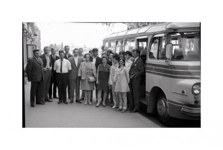 Sven-Erik Glader t.v. Bakre raden Carl-Gustav Marander, (syns bara litet av huvudet), framför honom Daniel Sten, båda från Sundom UF. Ingrid Saxberg i främre raden. Bussen var Oravais Trafiks och förare var Elmer Svenlin. Bussen är en Ford Trader med en Nummelakaross som var i turistutförande.