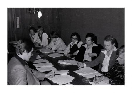 Karl-Johan Finne t.v. valdes till SÖU:s viceordförande, på andra sidan bordet från vänster Siv Gripström, Ulf Johansson, Ulrica Ahlbäck, Lilian Granlund, Lars-Erik Backman, Henry Kallvik, ?. Se årsbok 1979