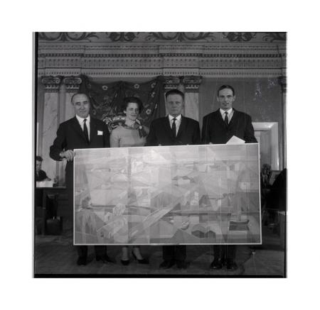 Försäkringsdirektör Pelle Lindholm, överlämnar hederspriset (Annie Krokfors' monumentalmålning Österbotten) till Pedersöre kommunlag Karin Österholm, Helge Anderssén och Hans Appel. Se årsbok 1966.