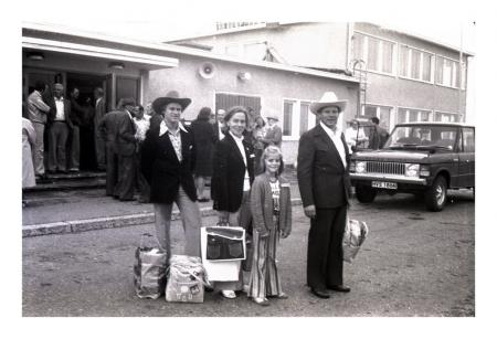 Ola Sandkvist, Gina Sandkvist, Ruth Sandkvist, Bertel Sandkvist, nyss hemkomna från SÖU:s resa till Vancouver Se årsbok 1976