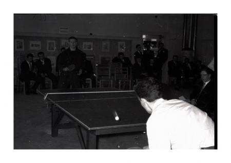 SÖU-finalen i bordtennis i samband med SÖU:s vårmöte 1961 i Kållby t.v. Bo Nyström från det segrande laget Smedsby UF, t.h. Rolf Hjort från Oravais UF, se årsbok 1960-1961