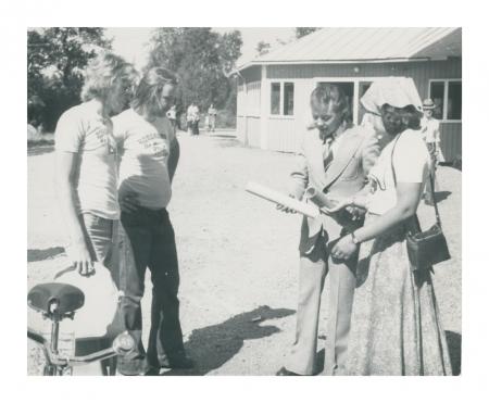 Kaj Lindqvist (dåvarande ordförande i Pjelax UF) och Kjell Strandberg, Hans Ingvesgård tar emot SÖU:s budkavle, Eivor Eklund-Back Se årsbok 1975