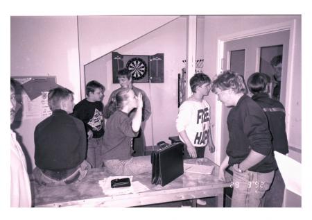 Från vänster Dan Roos (knappt synlig), Leif Hyöty (rygg), Thomas Herlin, Mikaela Häggkvist (gift Grönlund), Roger Herlin, Patrik Silfver, okänd, Jens Orre i dörren