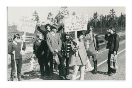 Sture Åman (från Åvist, Purmo) står och viftar bakom. Sune Lindén, Karl-Johan Bodbacka, Guy Kronqvist, Barbro Westerberg håller i plakatet till höger.