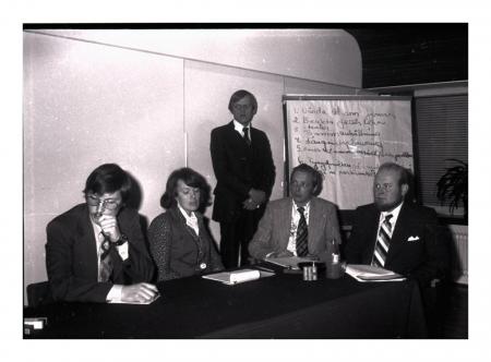 Deltagare i paneldebatten Varthän FSU, Jörgen Eklund, Ulrike Hjelt, debattledare Gustav Skuthälla bakom, Rolf Björkell, Fjalar Eklund Se årsbok 1976