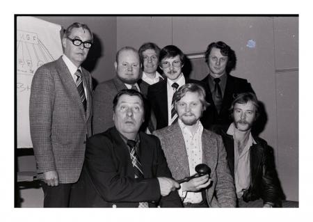 generalsekreterare Tor Holm, Fjalar Eklund (Ålands ungdomsförbund), Jörgen Eklund (Åbolands ungdomsförbund) Nils Malmberg (Nylands svenska ungdomsförbund) Leif Rex (Svenska österbottens ungdomsförbund), Per Vilander ger över ordförandeklubban till Thorleif Tverin, Bengt Lybäck barnförbundets ordförande