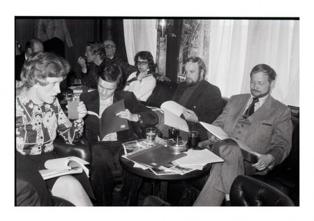 Debatt om ledarutbildning med rektorerna Iris Ericsson (Lärkulla), Martin Bäck (Lappfjärd), Bengt Backman (SÖFF), Torbjörn Ehrman (Vörå) Se årsbok 1975