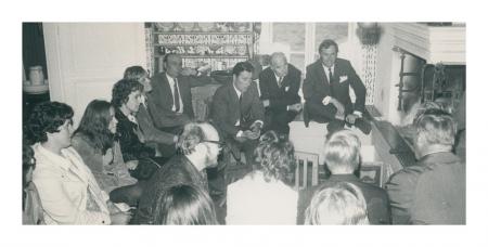 Frågetimme med Karin Stenlund till vänster i vitt, ?, ?, Gustav Skuthälla, Erik Andersson, Per Vilander, Paul Lindman, Anders G Lindqvist
