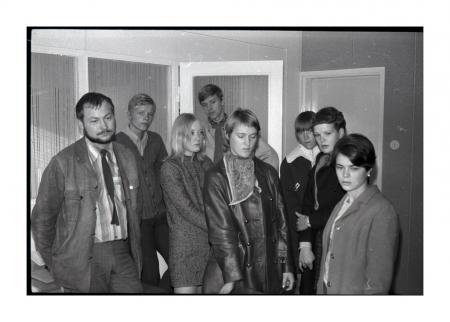 Vörå folkhögskola 1969-70. Rektor Torbjörn Ehrman med eleverna Mikael Björkholm, Kaj Fagerström, Maria Mäki-Valkama, Siv Hägg (gift Siv Granberg), Marita Nyberg (gift Marita Bagge), Saga Berts