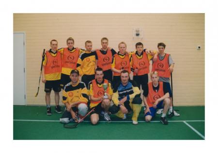 Övre raden f.v. Tommy Nylund, Jan Hermans, Simon Ingman, Johan Nykvist, Stefan Holm, Kim Ludén,Christoffer Wester, Ulf Präst, Kenneth Eklund, Ari Louhiranta, Jonas Englund Herrmästare i SÖU:s innebandyturnering, kom tvåa i FSU-finalen. ÖP 10/2000