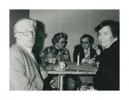 Gösta Stenberg, Anja Nyman (K E:s fru), Paul Lindell, Ulla Saarenheimo (avdelningschef vid Bostadsstyrelsen) Se årsbok 1975