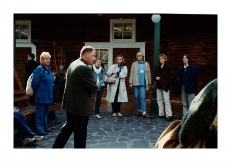 Corner huset i Kristinestad Dan-Anders Sjöqvist i kavaj och Helena Kari i jeanskläder och vit väska ÖP 5/2002