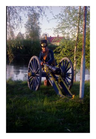 Juthbacka, historiskt skådespel med soldater vid Nykarleby älv