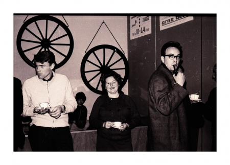 ?, Ingrid Saxberg, Tryggve Eriksson till höger med kaffekopp och pipa.