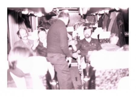 Sittande Robert Fredriksson, Bernhard Kiviniemi, Lasse Andersson på revyresa till Helsingfors