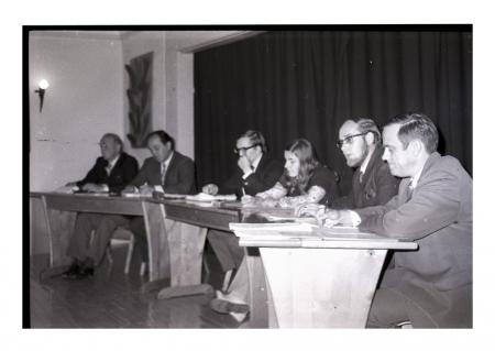 Debatt om nya ungdomslagen. Ulf Malm, Rudolf Olsson, Paul Lindell, Lisbeth Saxberg, ?, närmast kameran Vörå KD Erik Liljeström. Se årsbok 1972.