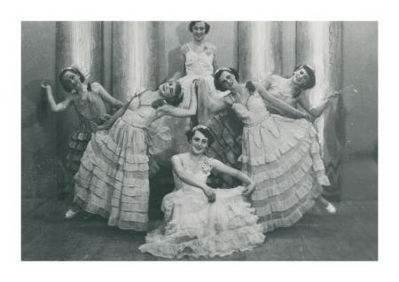 Carita Nygren, Els-Maj Sandell, Berit Smeds (Berit Gustavsson) bakom, Berit Soini (Berit Engblom), Els-Maj Rousko (Els-Maj Landgärds) sittande Maj-Britt Holm (Maj-Britt Pärus)