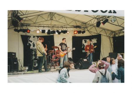 Niklas Nordström t.v. Andreas Backlund trummor, Anders Stolpe t.h. Suffering Bastards ÖP 1/2002