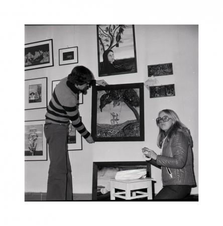 Man och kvinna hänger upp tavlor