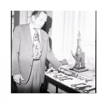 man visar gamla nycklar