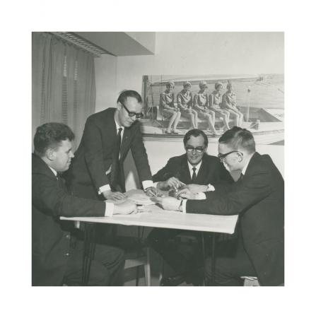 UF-rörelsens verksamhet planeras. Ombudsmännen diskuterar nästa femårsplan. Fr.v. Sven-Erik Glader Österbotten, Pertti Ahlfors Nyland, FSU:s generalsekreterare Tor Holm, Paul Lindell Åboland. På väggen finns en bild på Nordivalens värdinnor. Se årsbok 1968.