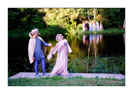 ”Messåmasdrööm” av Oravais teater, Älvkungen Ulf Johansson och hans drottning Pia Simons, i bakgrunden drottningens älvor ÖP 7/2002