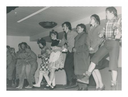 från vänster 4 flickor med likadana orangea halare: Susann Johansson (ansikte ej med i bild), Maria Lillkung, Sofia Karls och Susanne Svanström. Vidare: Lilian Lakaniemi, Carina Häggblad, Bengt Fridlund, Tore Häggman, Gunvor Häggman, Olav Björkström