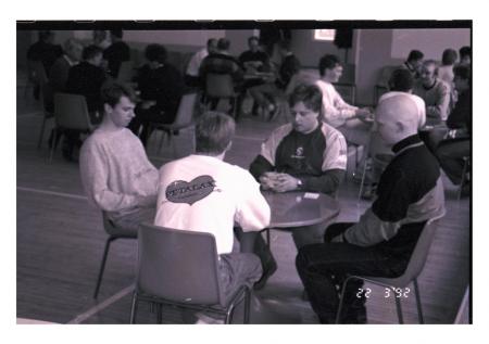 Torbjörn Strömsbäck med ryggen mot kameran, Hans Snickars mittemot (Petalax), Johnny Mård t.h. (Karperö)