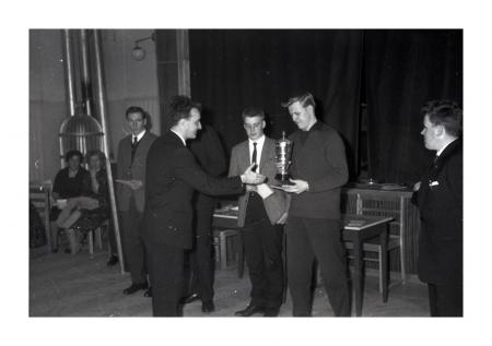 SÖU-finalen i bordtennis i samband med SÖU:s vårmöte 1961 i Kållby Bo Nyström från det segrande laget Smedsby UF tar emot pokalen av SÖU:s ordförande Trygve Erikson, t.h. Sven-Erik Glader, se årsbok 1960-1961