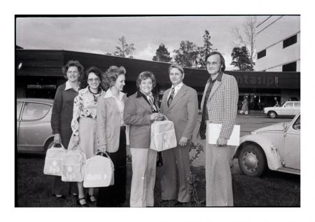 Beatrice Lassus, Marianne Öst, Dagny Vuorinen, Ingrid Nygård, Finnairs representant Harry Huhtamäki, och huvudansvariga Jan-Erik Frostdahl (Jan-Erik Fredman saknas) SÖU-väskor