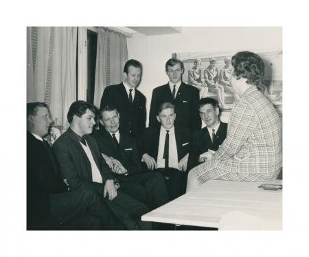 Under tiden 1.1-30.4.1968 arbetade en deltidsanställd ringsekreterare i varje ring. Här är de samlade för "ordergivning" inför säsongstarten. Fr.v. Ingmar Anderssén Pedersöre, Börje Norrgård Lappfjärd, Henrik Svarfvar Korsholm, Klas-Henrik Fors Kronoby, Martin Markén Oravais, Hans-Anders Lagerström Övermark, Per-Erik Andersson Munsala, Ingrid Saxberg Korsholm. På väggen finns en bild på Nordivalens värdinnor. Se årsbok 1968.