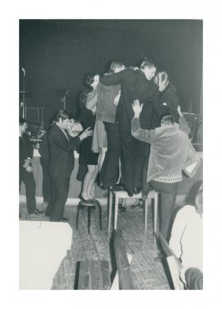 Ungdomar från Storkyro prövar hur många som ryms på ett bord som är en kvadratmeter. Se årsbok 1969.