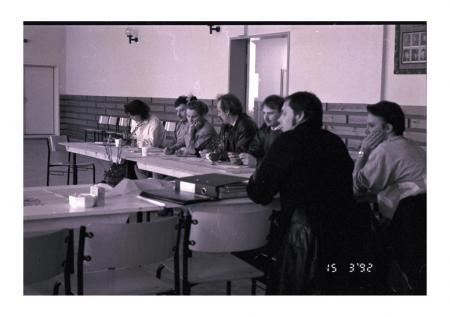 Harry Sand andra från vänster, Dennis Pellfolk närmast kameran, Pia Forsström (Pia Komsi), Bengt Österberg, Johan Silver sten.