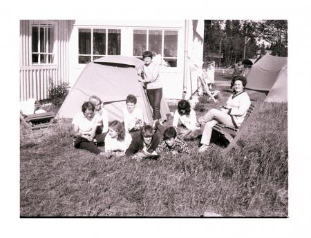 Sittande i mitten framför tältet Marita Nyberg (gift Marita Bagge) Lisbet Saxberg och Kaj Fagerström framför, Ingrid Saxberg t.h. på stolen