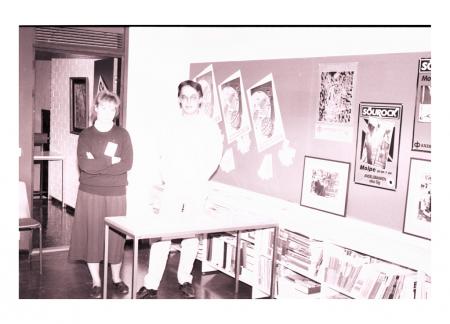 SKUT 1987 Två personer vid anslagstavla och bord med planscher för Let's dance