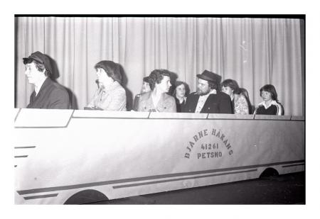 Fr.v. Osvald Holm, Lisen Jåfs, Märtha Svahn, Alf Burman, Inga-Lisa Holm (Inga-Lisa Eriksson), Ralf Pada, Kristina Paro (Kristina Eriksson), Gunilla Mörk-Backman (Gunilla Sandelin). I bakgrunden Alice Sandelin och Gunne Lax.