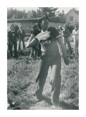 Sommarsamling med country & western och stövlkastning Jörgen Härmälä 2 fr.h., Peter Haga, Isabella Lundén, (Forsby på toppen tröja) Se årsbok 1975