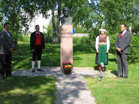 Blomsternedläggning vid Johannes Klockars byst framför Bygdegården. Jens Juthström, Patrik Peltoniemi, Yvonne Nordman, Steven Frostdahl