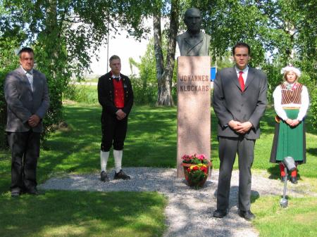 Blomsternedläggning vid Johannes Klockars byst framför Bygdegården. Jens Juthström, Patrik Peltoniemi, Steven Frostdahl, Yvonne Nordman