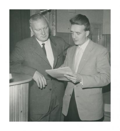 SÖU:s avgående ordförande William Hägg lämnar över SÖU:s handlingar till den nya ordförande Trygve Erikson, se årsbok 1959