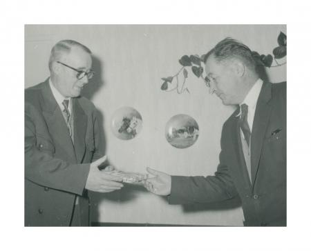 SÖU:s viceordförande Hugo Brommels avtackas av Joel Söderqvist med en bokgåva från styrelsen, se årsbok 1959