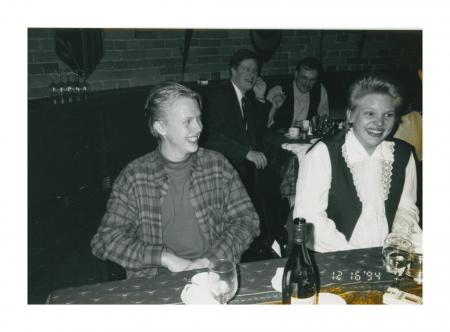 Praktikant Niklas Haglund och föreningsdoktorn Maria Nygård på julfest, Peter Bjurs i bakgrunden